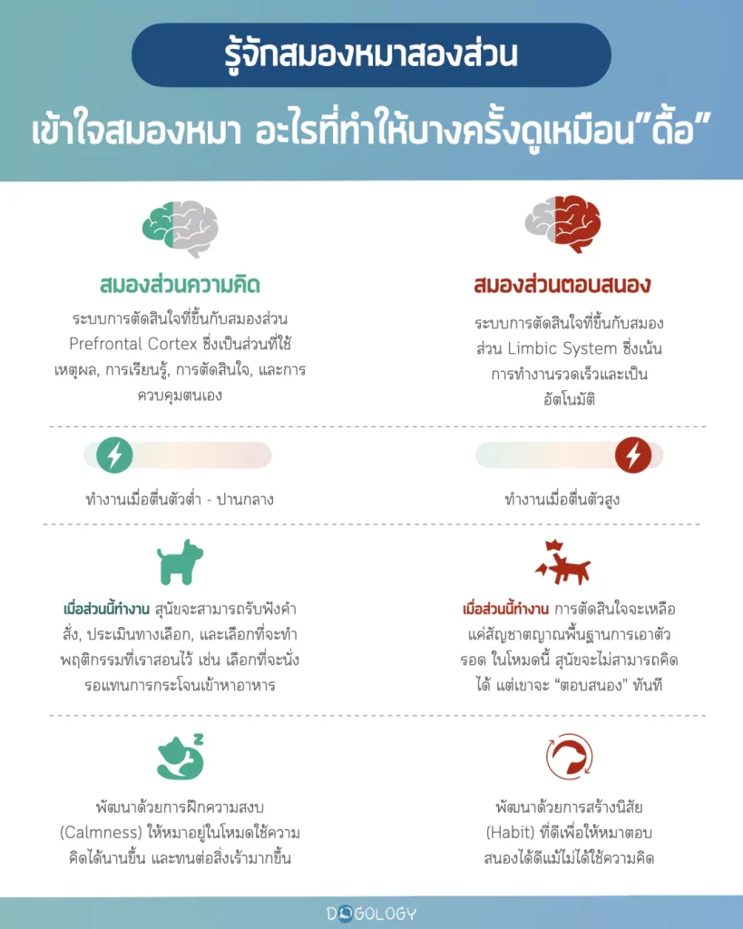 ทั้งสุนัขและมนุษย์มีสมองส่วนความคิดหลัก ๆ 2 ส่วนที่ทำงานควบคู่กัน ซึ่งไม่ใช่สมองซีกซ้าย ซีกขวา แต่คือสมองส่วนความคิด (Prefrontal Cortex) กับสมองส่วนสัญชาติญาณ (Limbic System)